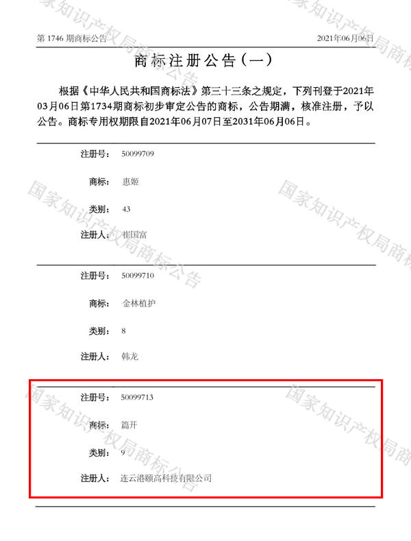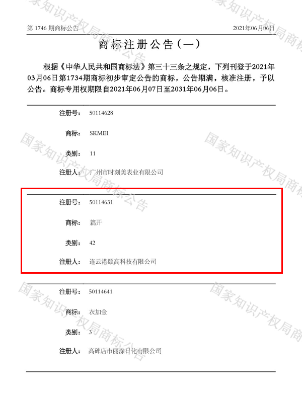 2021年6月5日,篇開商標(biāo)注冊(cè)公告(一)