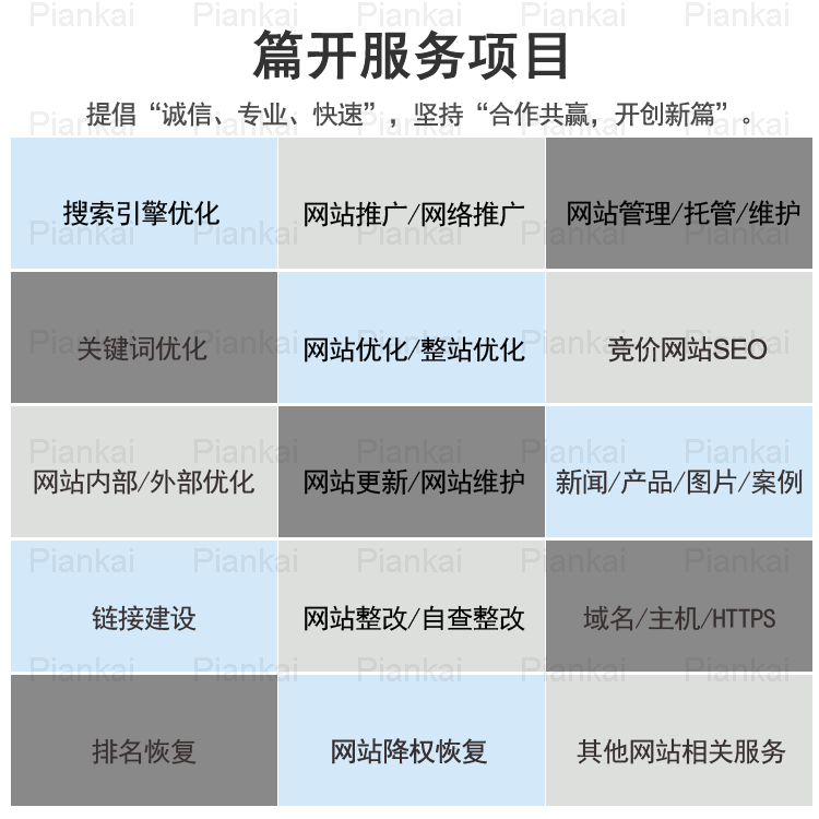 篇開(Piankai.com)網站主要關注于中小型企業和個人的需求。因此,我們假設你不一定有很多錢或時間可以投入到立即得到結果的推廣,所以將主要集中在相對簡單,便宜的事情——聘請篇開這樣的網站推廣公司,這樣你只需投入很少的資金,花費一定的時間也可以來提高你的網站的投資回報率。了解你需要做什么,投入一些時間和金錢,你的努力將會得到更高的流量的回報。